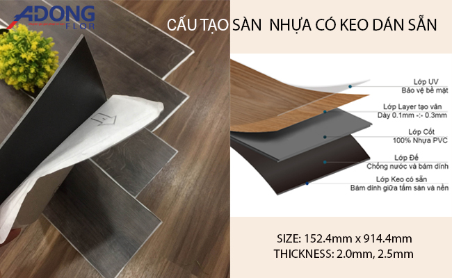 Hiện nay loại sàn có keo dán sẵn này đều là dạng tấm có kích thước trung bình: 152.4mm x 914.4mm và dày 2.0mm hoặc 2.5mm. Bề mặt Vân Gỗ đẹp, nhiều màu độc đáo, có thể phối màu dễ dàng cho nội thất.