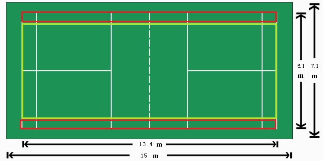 Chiều rộng sân: 6.1m – Chiều dài 13.4m. Xung quanh là biên, chiều dày của sàn vinyl chuyên dụng cho sân cầu lông dày: 4.5mm, 4.7mm, 5.0mm, 6.0mm, 7.0mm … Tuy nhiên hiện nay sàn cho sân cầu lông được hoàn thiện sẵn tức là đã được kẻ vạch sơn (đường line) sẵn sau đó chỉ cần trải các tấm ra gắn lại với nhau bằng băng keo dính hoặc keo tại các mối ghép. Sau đó các mối ghép được hàn lại với nhau bằng dây hàn. Bốn xung quanh của sàn sẽ được bọc bằng 1 lớp băng dính chống va chạm hoặc sê dịch tấm sàn.