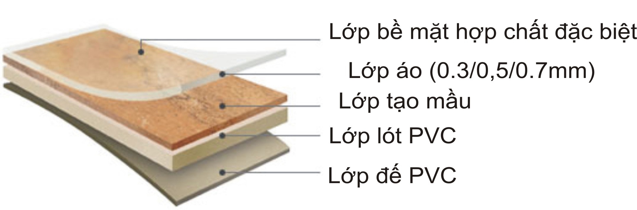 – Lớp lót PVC: Là lớp nhựa PVC, giúp định hình cho sản phẩm. Có tác dụng chống cong vênh do nhiệt độ thay đổi, đàn hồi tốt, chống cháy lan, khả năng chịu lực cũng như chịu nước cực kỳ tốt